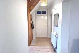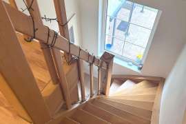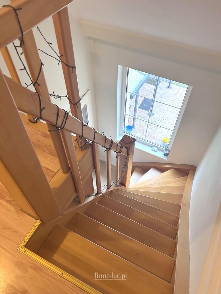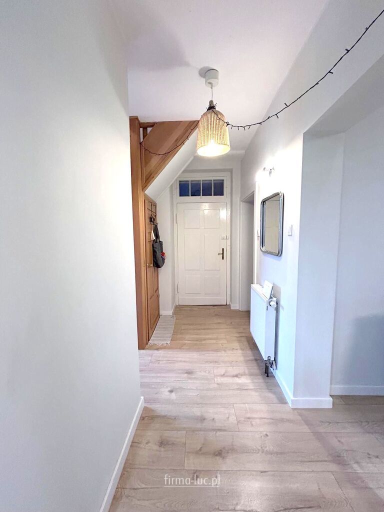 Schody: solidne, drewniane. Ściany: szpachlowane i malowane,