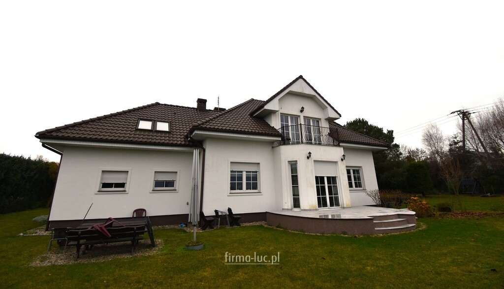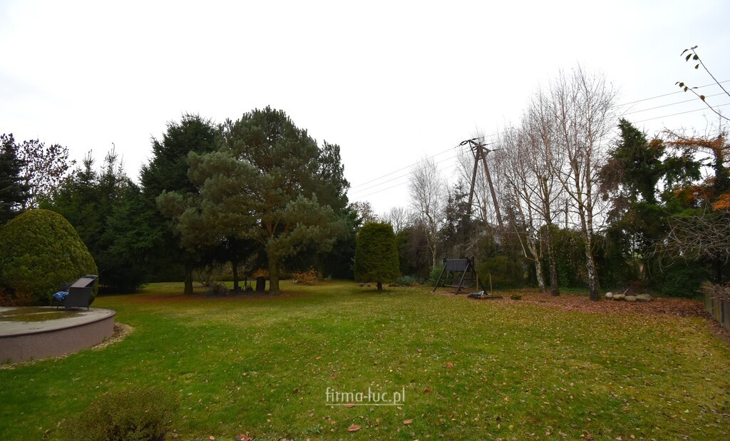 Teren wokół domu w większości obsadzony trawą, z niedużą ilością pięknych drzew, ładnie zagospodarowany, ogrodzony, z bramą wjazdową otwieraną na pilota.