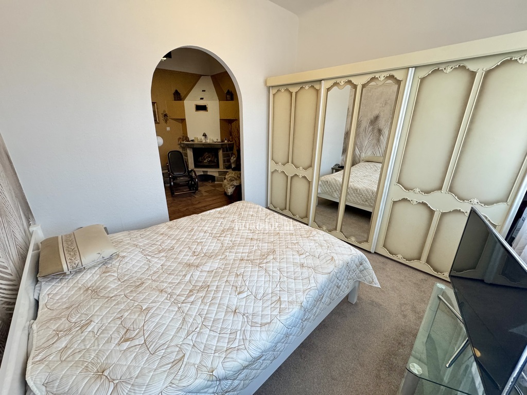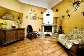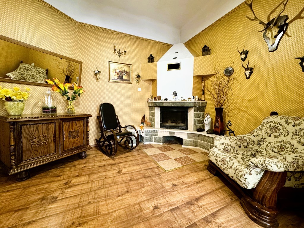 W salonie znajduje się klimatyczny kominek, który poza walorami estetycznymi pełni również funkcję dodatkowego źródła ogrzewania, tworząc wyjątkową atmosferę wnętrza.