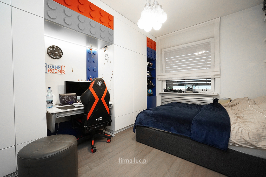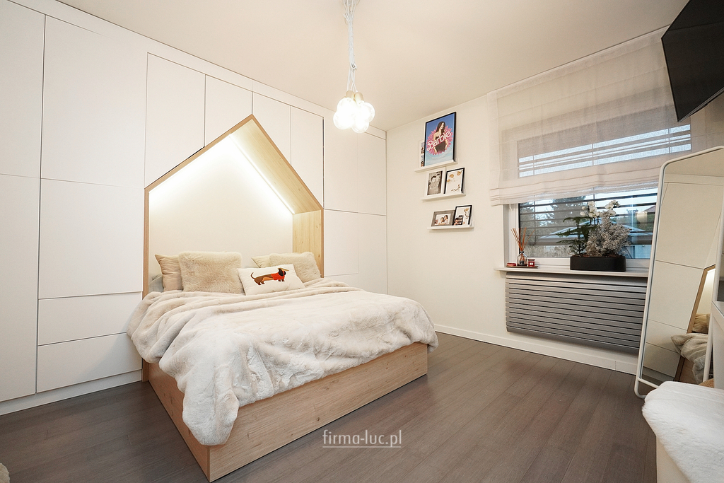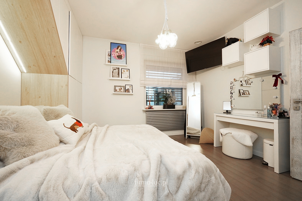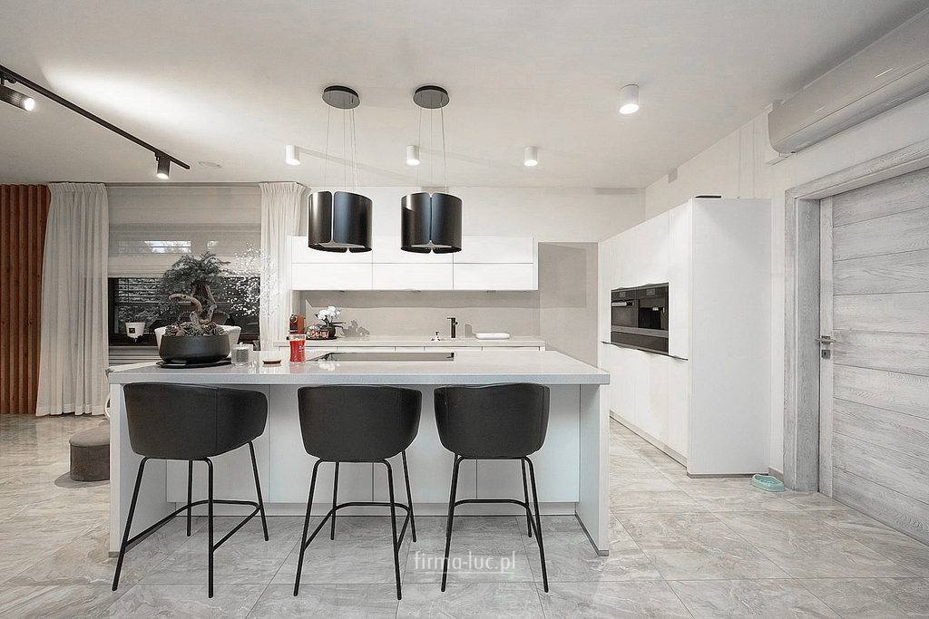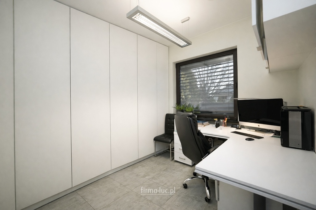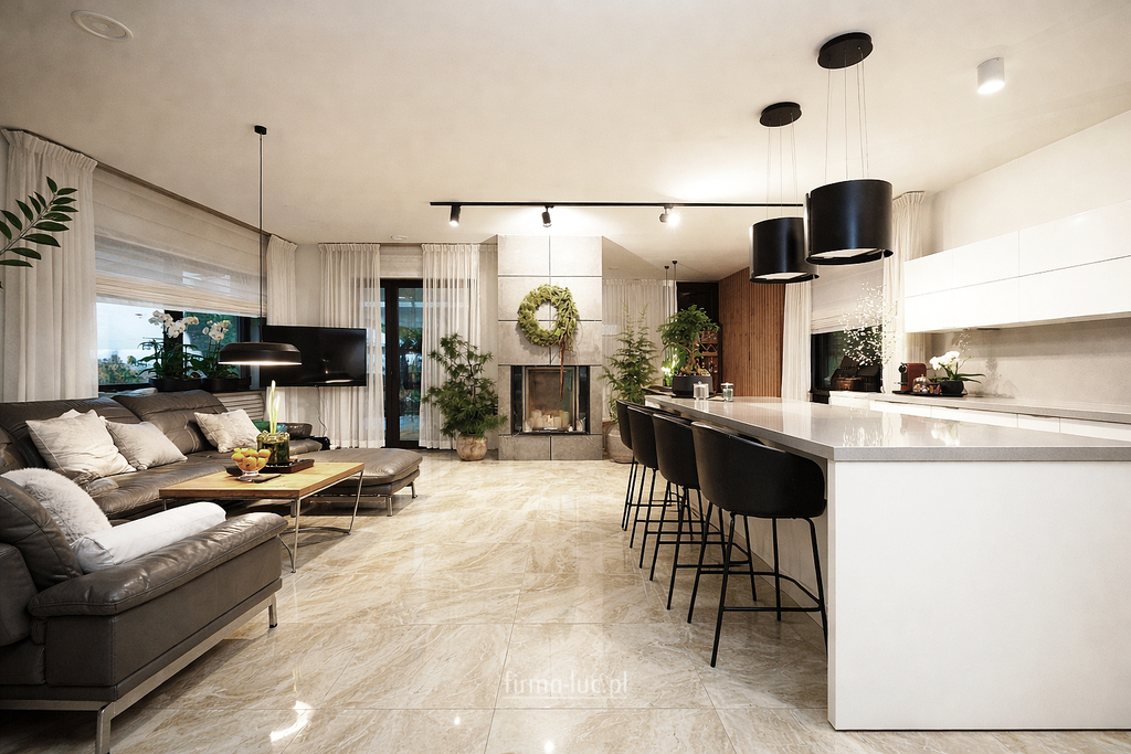 Sercem domu jest przestronny salon z aneksem kuchennym i kominkiem rekreacyjnym, który tworzy klimat i sprzyja domowej atmosferze. Układ funkcjonalny obejmuje trzy sypialnie, gabinet oraz trzy komfortowe łazienki. Całość zaprojektowana z myślą o wygodnym życiu rodziny oraz pracy zdalnej.