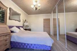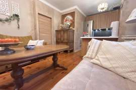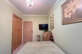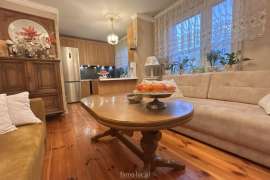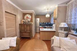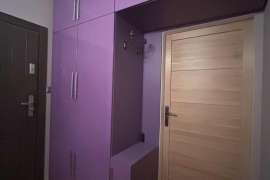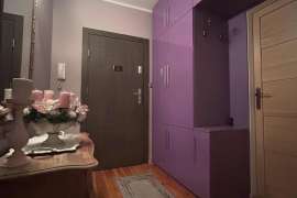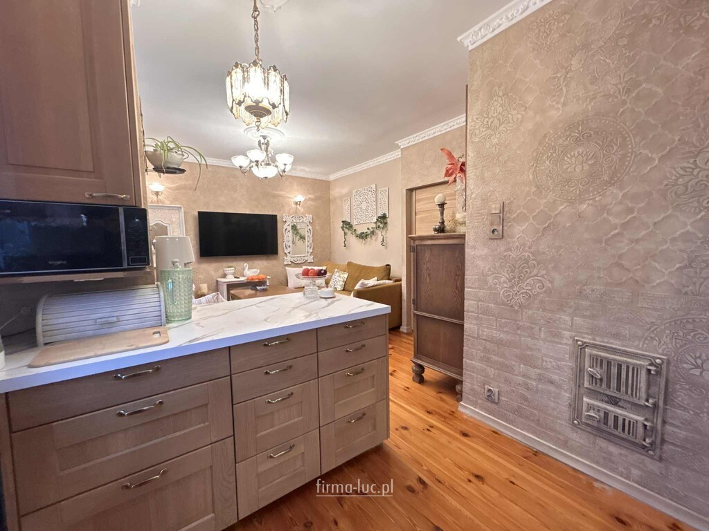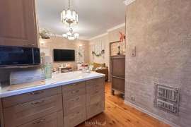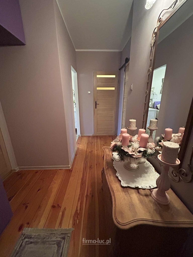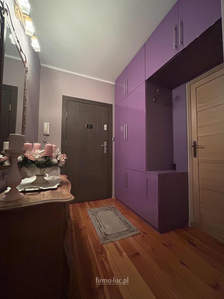 Mieszkanie o ciekawej i nietuzinkowej aranżacji. Na ścianach gipsowa struktura, w salonie drewniane drzwi przesuwne, w przedpokoju nowoczesna szafa na wymiar, podłogi częściowo deska, częściowo panele, drzwi wewnętrzne dębowe, meble w kuchni w zabudowie również dębowe.