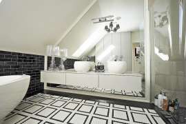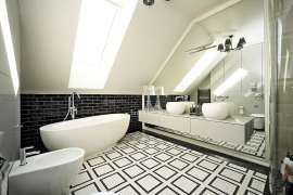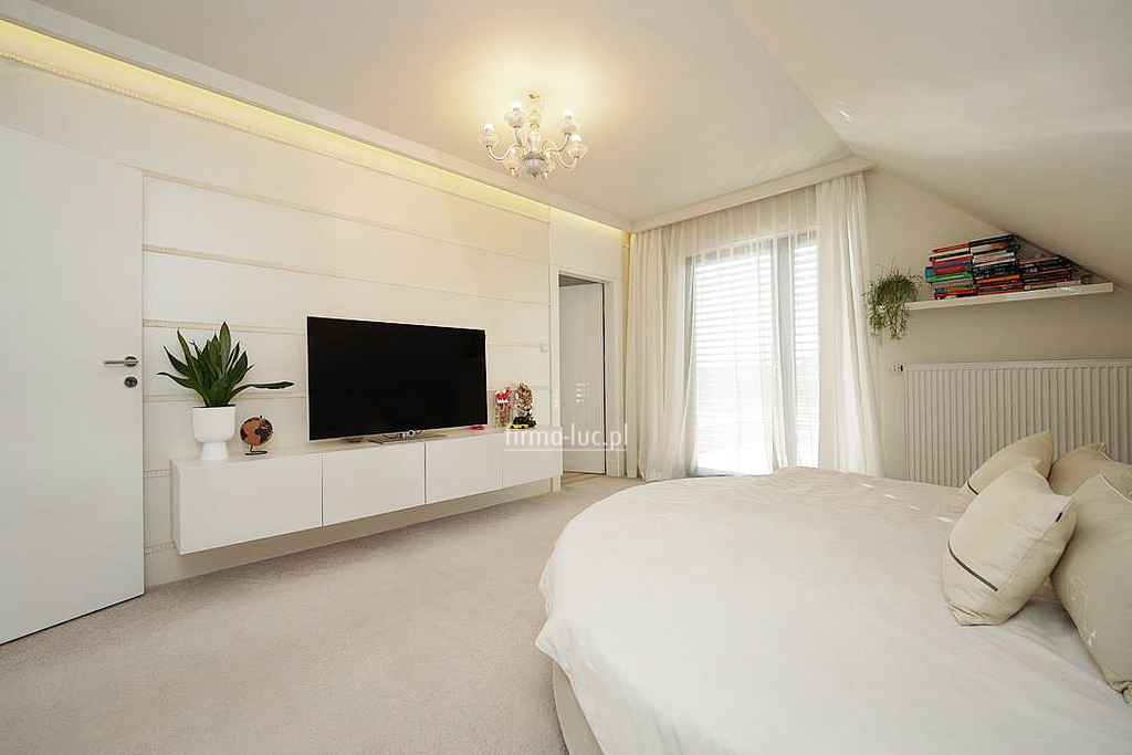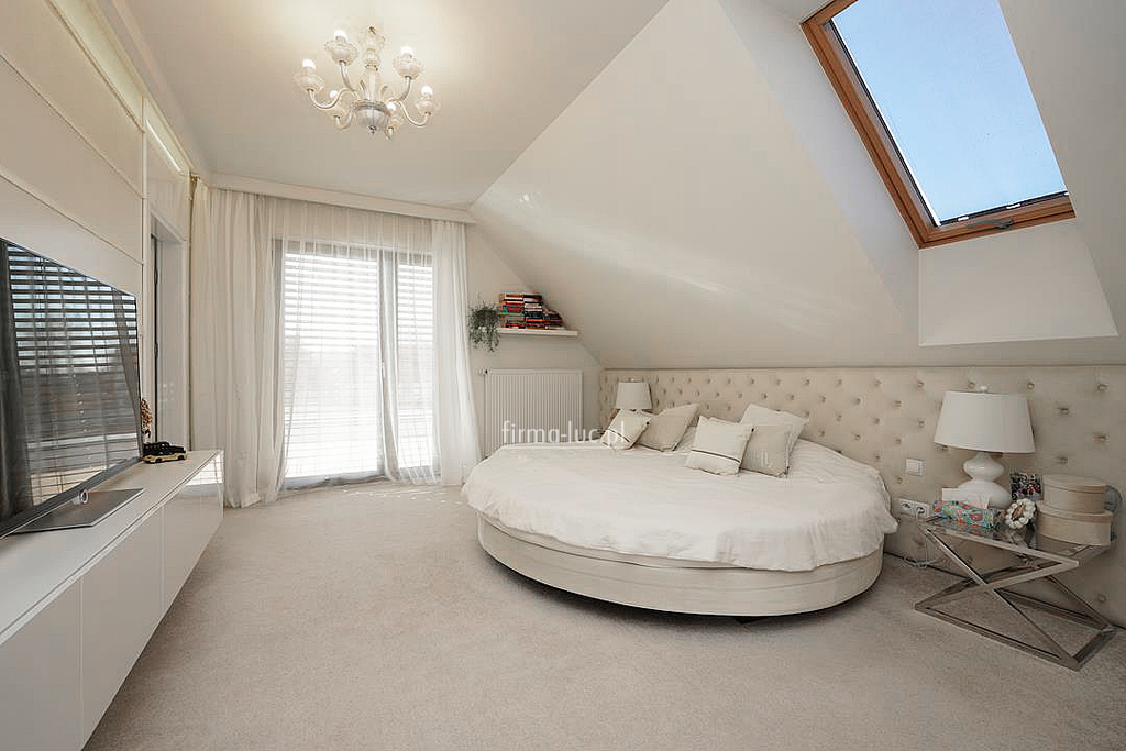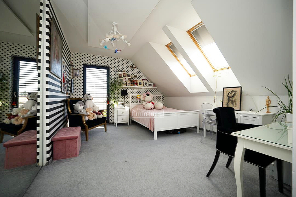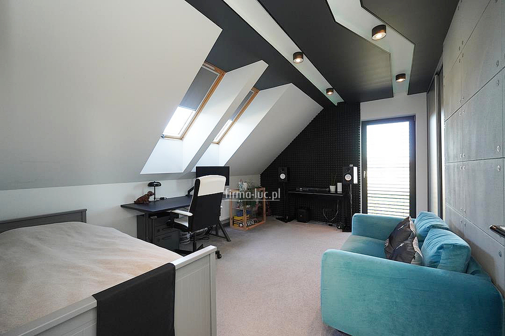 Na poddaszu użytkowym zaprojektowano komfortową strefę prywatną domowników. Znajdują się tu trzy duże sypialnie, w tym jedna z własną garderobą oraz wyjściem na taras, co tworzy wyjątkową przestrzeń do wypoczynku. W centralnej części piętra znajduje się dodatkowa garderoba, a całość uzupełnia przestronna łazienka wyposażona w kabinę prysznicową oraz wannę.