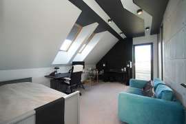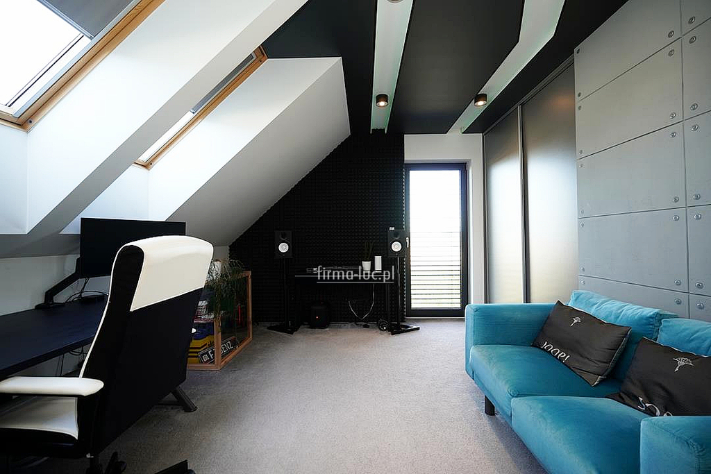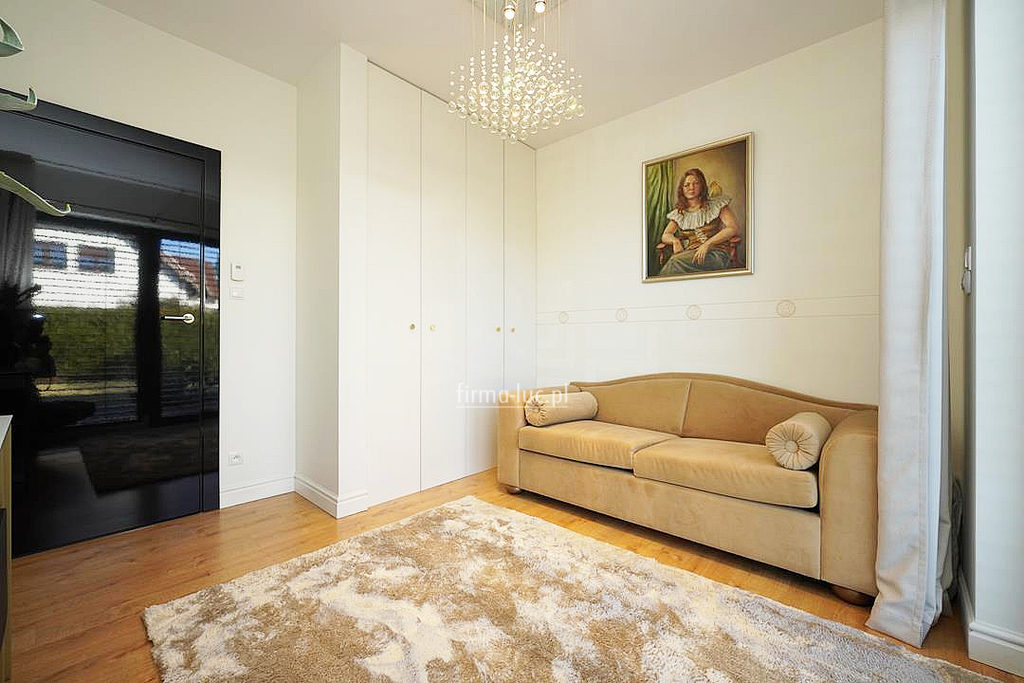 Na parterze znajduje się również gabinet, który może pełnić funkcję pokoju do pracy lub dodatkowej sypialni, łazienka, przedpokój, a także kotłownia z pralnią oraz garaż dwustanowiskowy połączony z częścią mieszkalną.