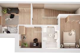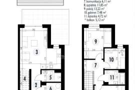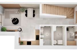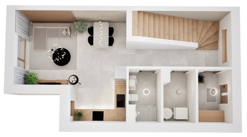 - Na parterze znajduje się przedsionek z miejscem na szafę w zabudowie, komunikacja, salon z aneksem kuchennym, łazienka oraz pomieszczenie techniczne. Pod schodami można utworzyć dodatkowy schowek.