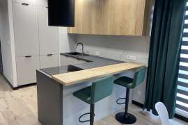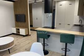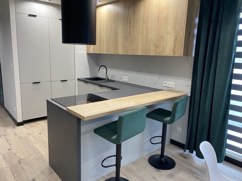- salon z aneksem kuchennym w pełni wyposażonym we wszystkie niezbędne sprzęty AGD: lodówka z zamrażarką, zmywarka, piekarnik, płyta grzewcza, okap. W salonie duży narożnik, stolik kawowy i telewizor